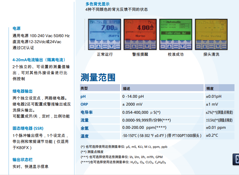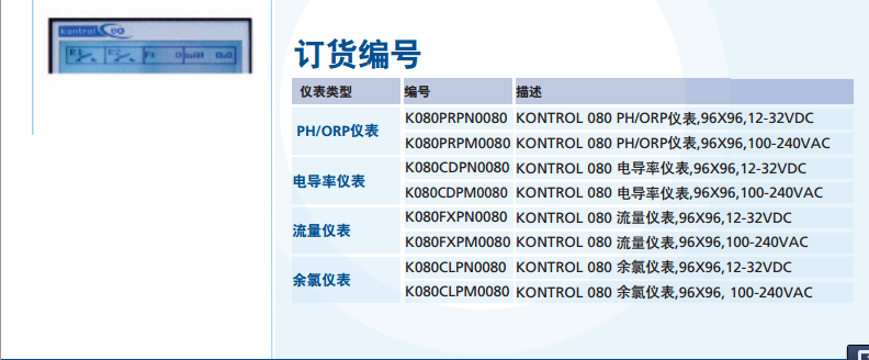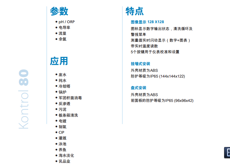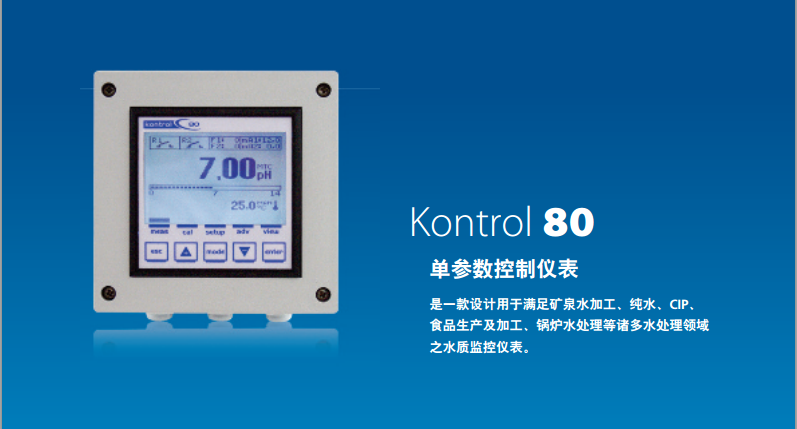 Kontrol 80系列單參數(shù)儀表 是一款設(shè)計(jì)用于滿足礦泉水加工、純水、CIP、食品生產(chǎn)及加工、鍋爐水處理等諸多水處理領(lǐng)域之水質(zhì)檢測(cè)控制儀表。