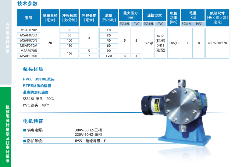Seko Dosy系列機械隔膜計量泵,具有彈簧復(fù)位機械裝置和PPS外殼。內(nèi)置雙凸輪結(jié)構(gòu),運行穩(wěn)定無噪音,流量精準(zhǔn),馬達(dá)絕緣等級F,外殼材料耐酸堿腐蝕,具有優(yōu)良的高溫抗蠕變性能;整泵的防護(hù)等級達(dá)到IP55。