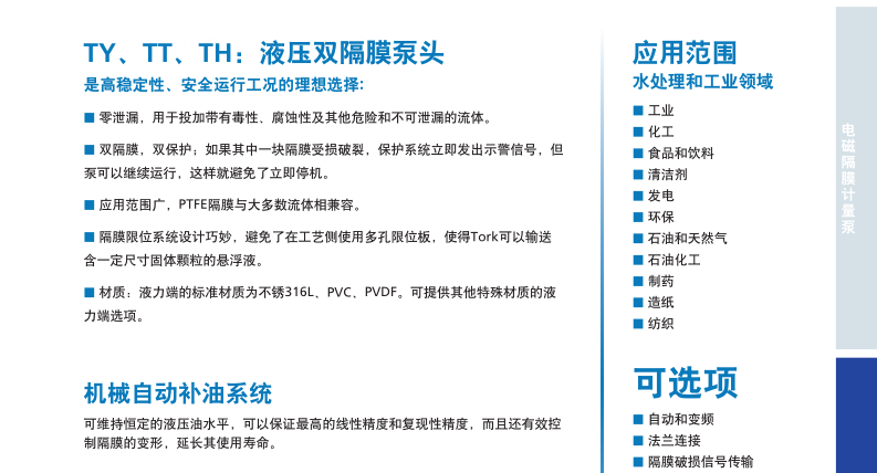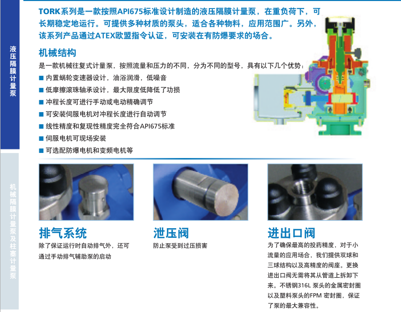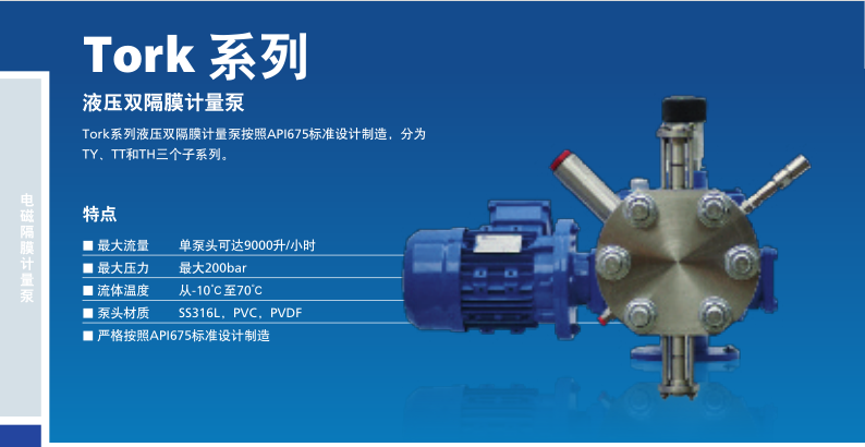 Tork系列為液壓雙隔膜計量泵,是SEKO 基于經(jīng)典產(chǎn)品Exacta系列的經(jīng)驗,革新設(shè)計制造而成,符API675標(biāo)準(zhǔn)。機械裝置即使尺寸不同,也能并聯(lián)行程有效的計量泵單元,簡化了設(shè)備的裝配和安裝。