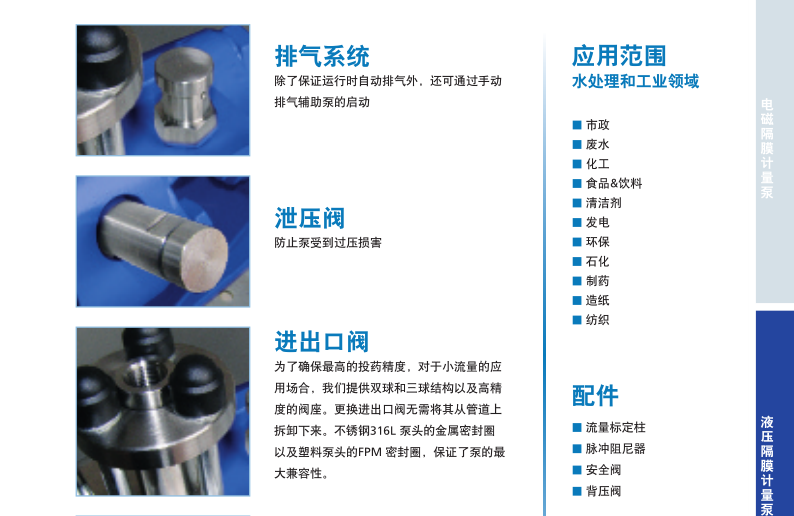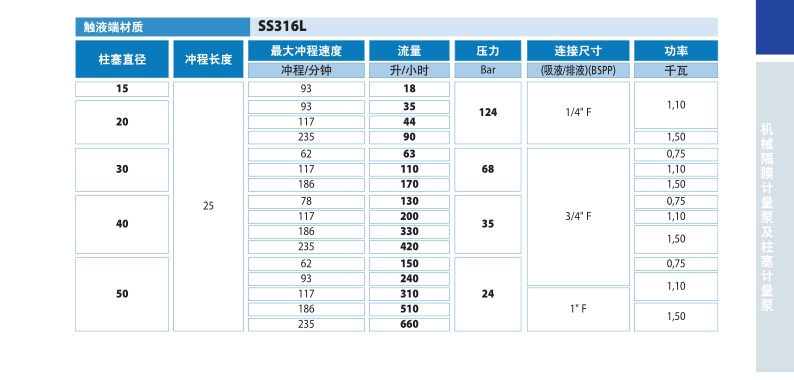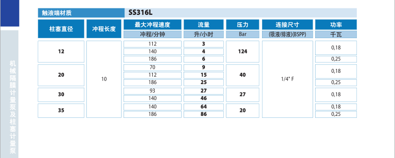 主要特征■ 最大流量:660升/小時,最大壓力124bar■ 泵頭材質(zhì):SS316L,PP,PVDF和PVC■ 按照API675標(biāo)準(zhǔn)設(shè)計制造■ 應(yīng)用范圍:石化、化工、電力、油田、市政水處理等