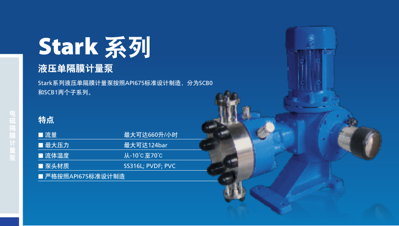 Stark系列液壓單隔膜計量泵按照API675標(biāo)準(zhǔn)設(shè)計制造。該系列泵材質(zhì)選料考究,可以應(yīng)用于不同行業(yè)的流體投加和混合工藝。此外,該產(chǎn)品完全滿足ATEX標(biāo)準(zhǔn),因此可以在惡劣工況下使用。