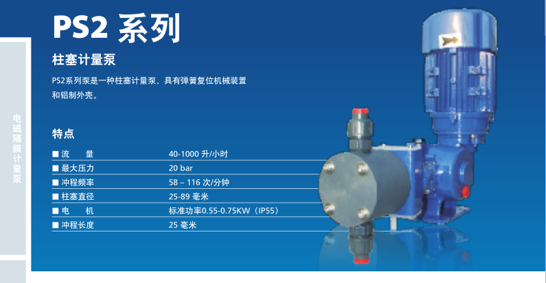 PS2系列泵是一種柱塞計量泵,具有彈簧復(fù)位機械裝置和鋁制外殼。